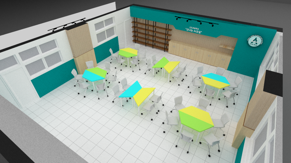학생들이 수업시간에 앉게 될 사다리꼴 책상,