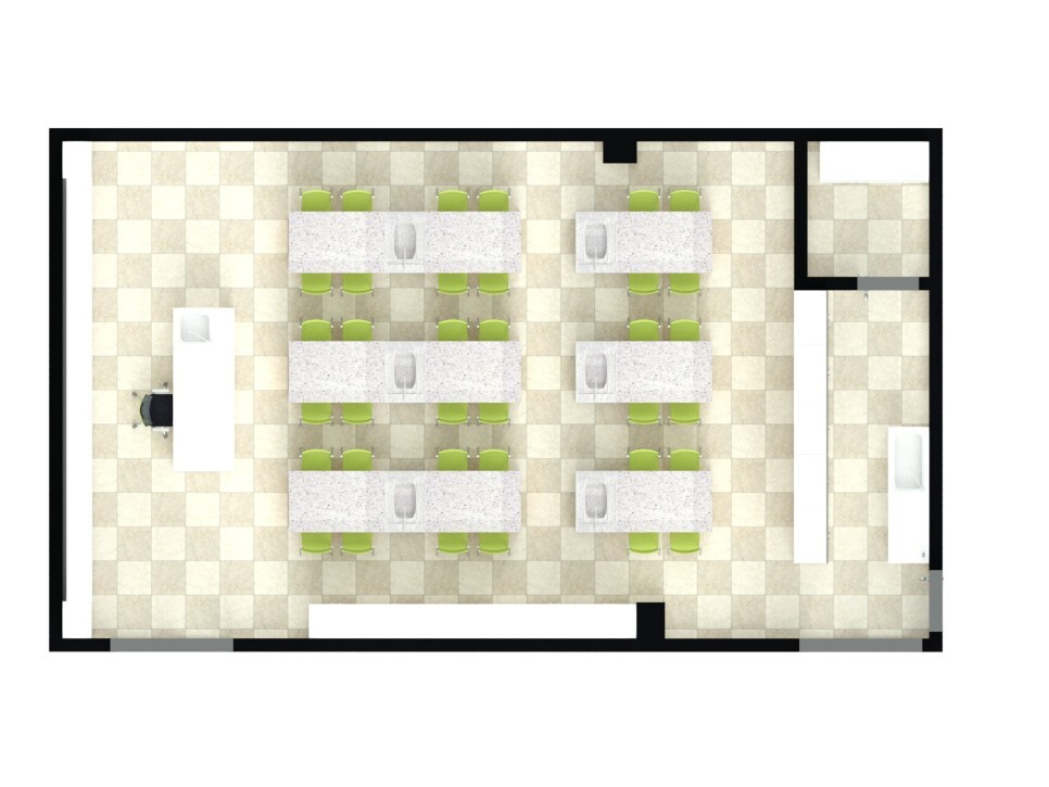밝은 라미스 상판의 실험대와 그린 색상의 학생용 의자가 들어가 전체적으로 화사한 모습을 보여줍니다.