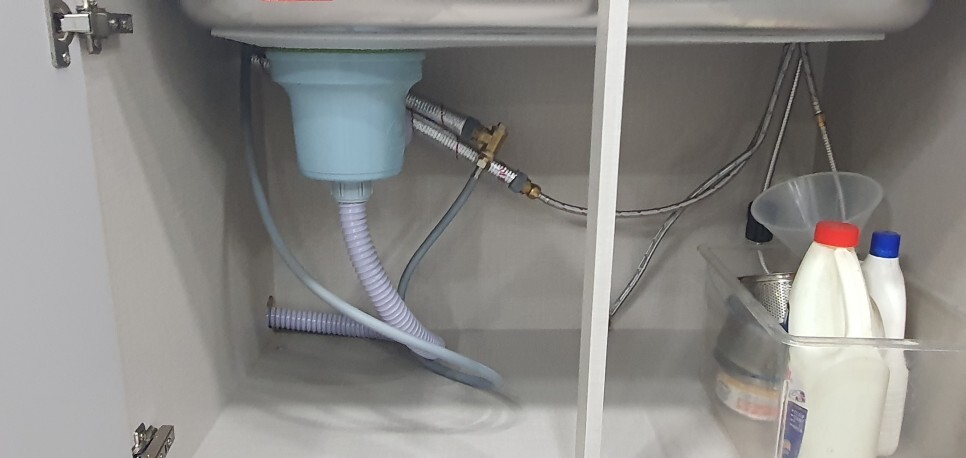 눈세척기 호스를 싱크대 하부에 있는 수도 배관과 연결하여 물을 공급받아 사용할 수 있도록 설치했습니다.