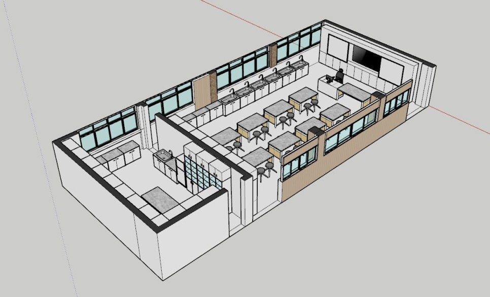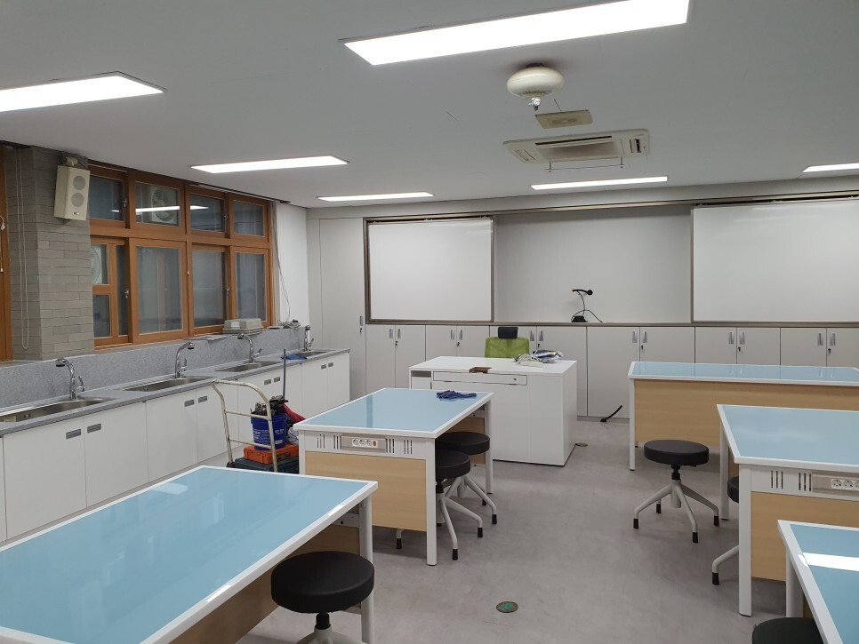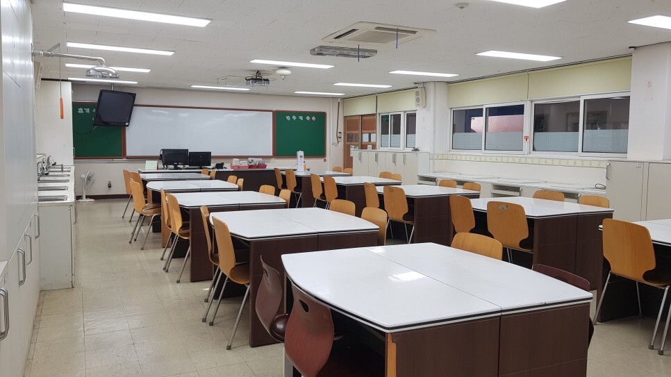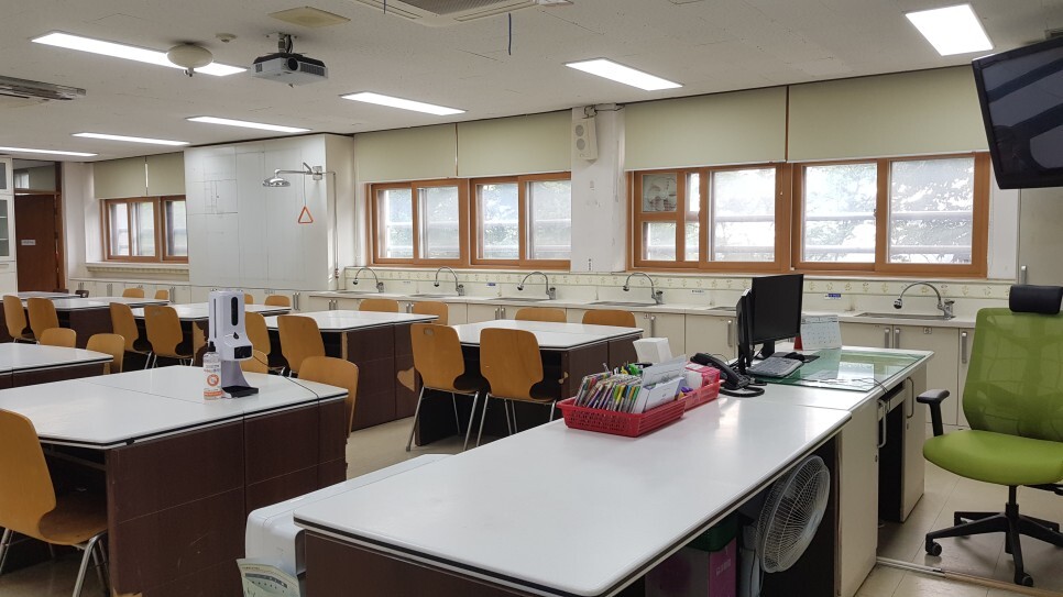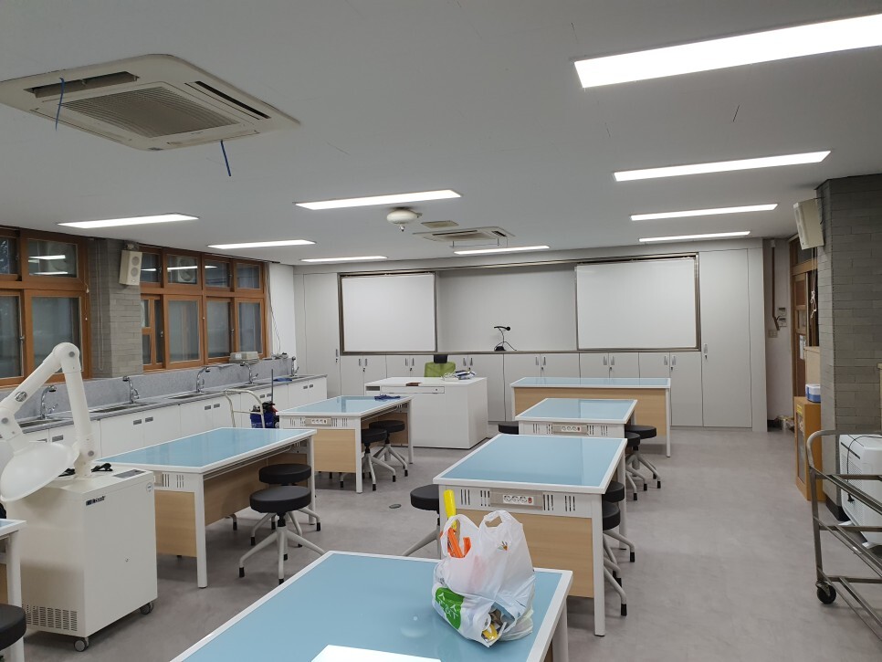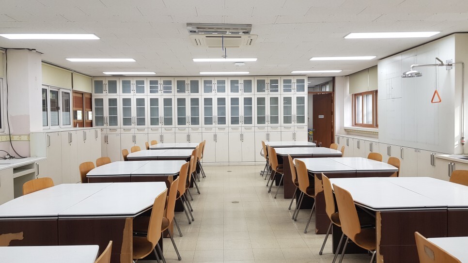 밝은 실험대 색상과 목공사 인테리어 부분이 교실을 전체적으로 조화롭게 보이도록 하는 거 같습니다.