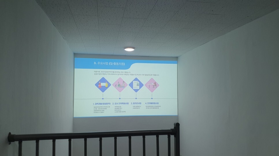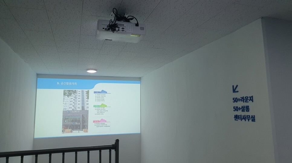 라운지와 살롱으로 내려가는 중간 계단 벽에 강서50플러스센터의 안내와 홍보영상등을 보여주기 위해 빔프로젝터를 설치하여 빈벽에 직접 투사하여 전달할 수 있도록 공간활용을 극대화하였습니다.