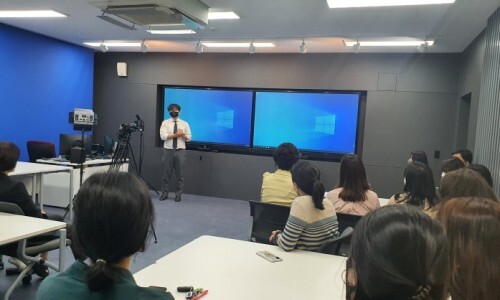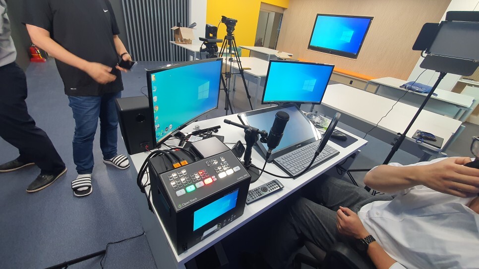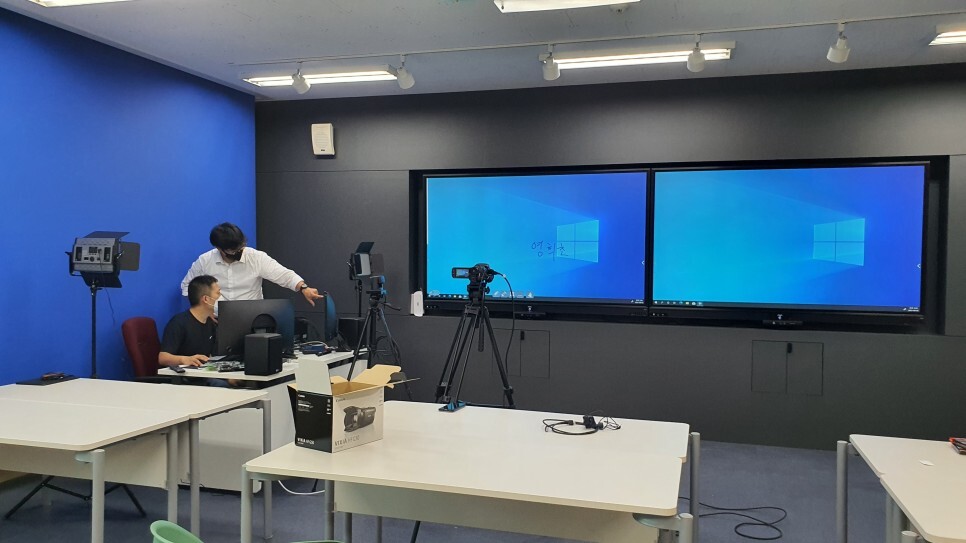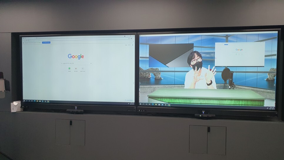 전면부의 2개의 전자칠판에서는 한곳에서는 방송내용이 송출되고,