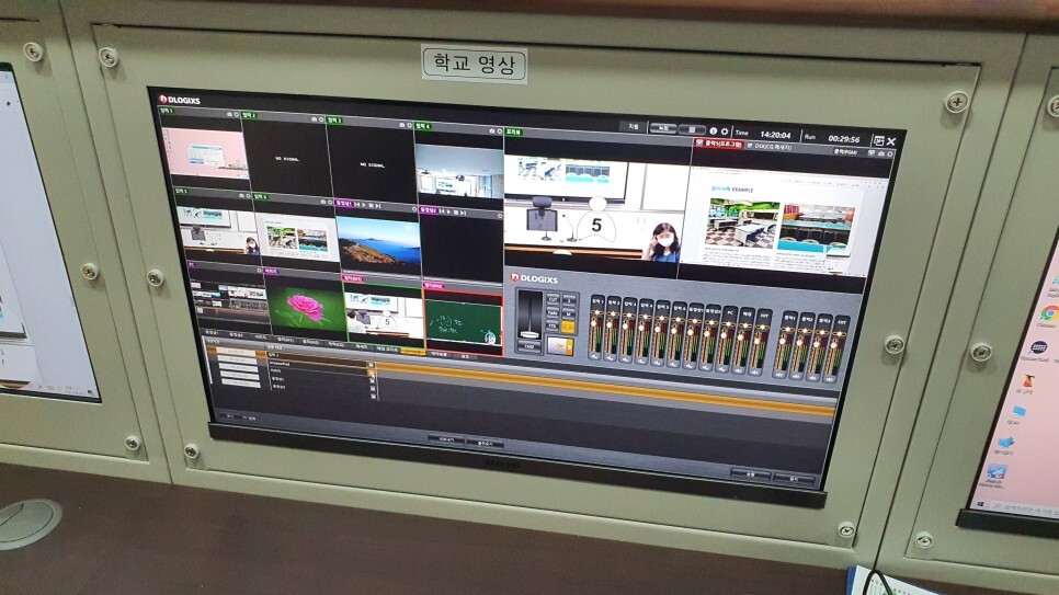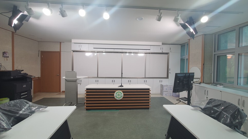 칠판보조장 앞에 블루 스크린을 설치했습니다. 환경과 상황에 따라 크로마키를 활용하여 좀 더 전문적인 방송이 진행되도록 했습니다.
