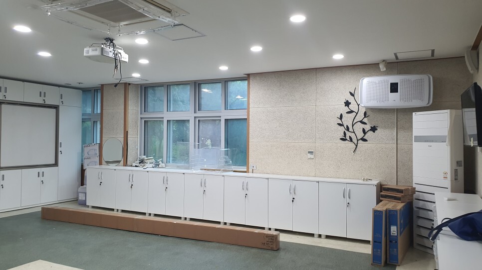 넉넉하게 장비 및 물품을 수납할 수 있도록 전면부 칠판보조장, 창가 쪽, 후면부 모두 수납장을 배치했습니다.
